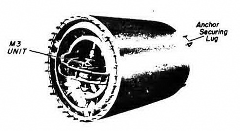 Operation. When the mine is dropped, a safety fork is removed from the booster re-lease mechanism, allowing the booster to house over the detonator. As the mine separa-tes from its anchor, a pin is withdrawn from the hydrostatic clock. The mine then takes depth by a loose-bight hydrostat system. Water pressure depresses the clock spindle at a depth of 15 feet. starting the clock. The clock runs off its delay period, and the firing unit begins its testing cycle. |
