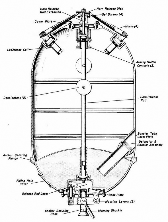 Operation. The mine takes depth by hydrostat. Mooring tension pulls out the mooring spindle against spring tension of the inside of the base plate. Withdrawal of the mooring spindle forces a catch upward, thereby actuating a horn-release rod which extends through the longitudinal axis of the case to the cover plate. Movement of this rod forces the horn-release disc upward, allowing the horns to snap our and lock in the "out" posi-tion, and closes the arming switch on the wiring panel. The mine is now armed. |