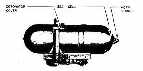 When a horn is bent, the brass tube at the base of the horn breaks, allowing sea water to enter a Le Clanche cell under the horn, energizing it and producing a current sufficient to fire the detonator. |