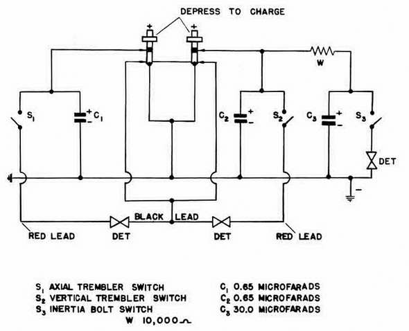 2. If the mine strikes a surface producing a decelaration of between 20 and 200g, one or both of two vibrating "trembler" switches closes, discharging the condenser through an electric igniter in the master switch. |