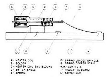 Fuse Delay Switch (Figure 96). This switch is an electrically-operated delay type used in conjunction with delay bomb firing and period delay mechanism operation in this mine. It consists of a small cylindrical shell, D, mounted in a fuze clip, L, on an insulating board, I. A circuit is made from H to K through the spring copper strip, G, down the spring-loaded spindle, F, which is held in place by the adhesive action of a soft solder plug, B. The circuit continues from the spindle into the heater coil, A, and out through the shell, D. At the end of a heating period predetermined by the basic switch design, the solder melts and spring, E, forces spindle, F, to the left, thus breaking the circuit from H to K and making a circuit from H to J through the conducting strip, G. |