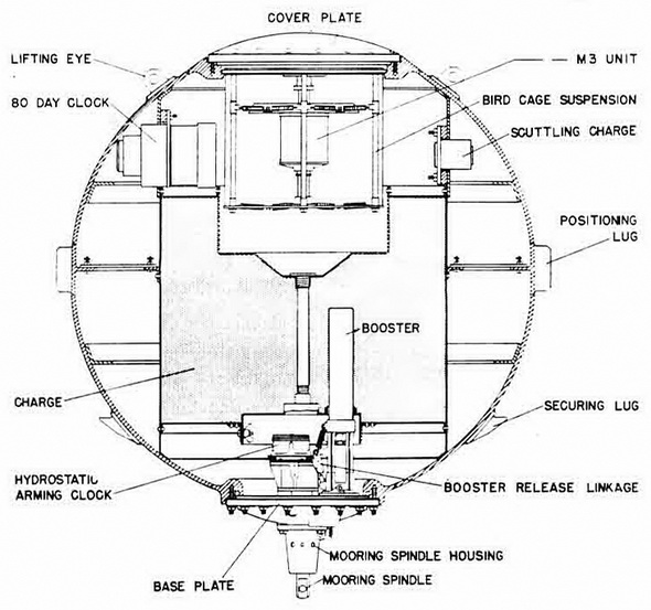 Operation. The mine took depth by a loose-bight hydrostat system. Morring tension pulled out the mooring spindle, tripped the booster-release lever, and released the lock-ing balls from the clock-starting spindle. Water pressure depressed the clock spindle at a depth of 15 feet, starting the clock. The clock ran off its delay period, and the unit star-ted its testing cycle. |