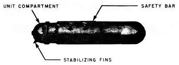 Operation. When the mine is launched, a spring-loaded safety bar is released from the top center line of the case, thereby unlocking the hydrostatic clock and booster- release mechanism. Water pressure depresses the clock spindle and operates the booster-release mechanism, respectively, at a depth of 15 feet, starting the clock and allowing the booster to house over the detonator. The clock runs off its delay setting, and the firing unit begins its arming cycle. |