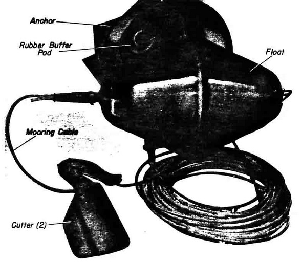 Operation. Impact with the water shears the tail. The buoyancy of its case and the expelling effect of the rubber buffer pad cause the float to rise toward the surface as the anchor sinks. As the anchor continues to sind, the entire length of mooring cable pays off the mooring drum and the float and cutters take depth according to the depth of the water. |