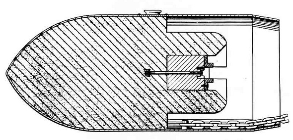The Anchor. This is a steel cylinder with an ogival nose, resembling the case of a BM 1000. It is 62 inches long and weighs about 1,000 pounds. Approximately 865 pounds of cement are cast into the forward part, the after end of the casting being formed to pro-vide (1) positioning seats for two cutters and (2) a mooring-cable drum. |