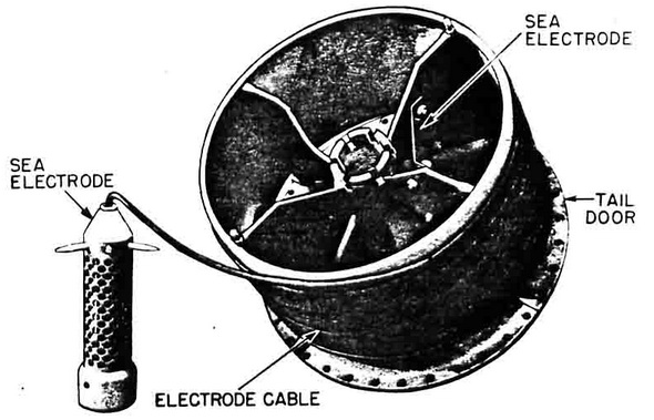 In principle, the "raumschutz" device consisted of a rubber-covered cable 165 feet long with a copper electrode at the end of the cable and another on the mine-case and insulated from it. When a magnetic sweep of the openend sea-current type passes over, a small current would be induced into the cable, a sensitive relay in the mine would re-act, and the unit would be rendered passive for the duration of the sea current plus a predetermined period. This system was designed for mounting on the LMB mine laid by S-boat. The mine electrode was mounted between the fins of a special tail-door, and its lead was led through the fins of a special compartment. The cable was wrapped around the fins of the tail door, and the tail electrode stowed inside the winding. Some experi-mentation has been carried on with nickel electrodes; but, for some reason unknown to the Germans, the nickel electrodes were destroyed by galvanic action after a few weeks in sea water, so copper electrodes were adopted. |