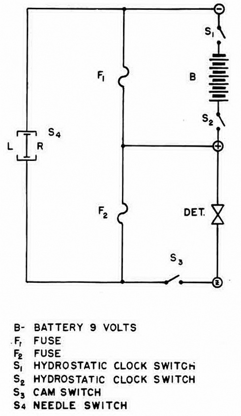 Arming. When the hydrostatic clock runs off its delay period, S1 and S2 close, blow-ing fuse No. 1. This releases a clock escapement and starts A.L.A. S4 makes and breaks during A.L.A., blowing fuse No. 2. Upon completion of A.L.A., S3 closes and the unit is alive. |