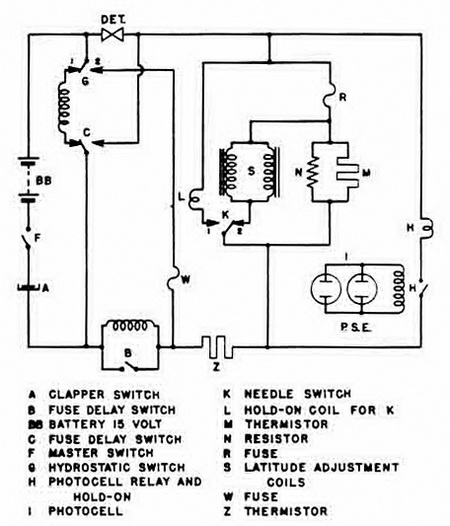 P.S.E. Firing. The unit is fitted with two photo-electric cells designed to be energized upon exposure to light. The resultant current operates relay H, completing a circuit through H, Z and the detonator. The detonator will fire as above when Z heats suffici-ently. |