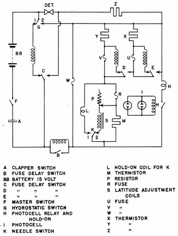 A second RED actuation causes repetition of the above, with X heating, U blowing, and fuse-delay switch E switching in the detonator and thermistor Z. Z, being cold, can-not pass enough current to operate L, and the cirucit again returns to normal. |