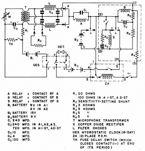 1. Running of UES finally closes switches a-g and b-c, putting the detonator into the circuit. A few minutes later, e-f closes and B 1 energizes the microphone circuit and fuse delay switch TH. TH heats for several seconds before switching itself out and closing (th) thus preventing initial surge from firing the mine, since (th) breaks the holding cir-cuit to Relay B. All sound impulses on the microphone produce alternating currents in the transformer circuit which are shunted by R2, then filtered and rectified. The value of the direct current, led to relays A and B, is determined by the sound level. |