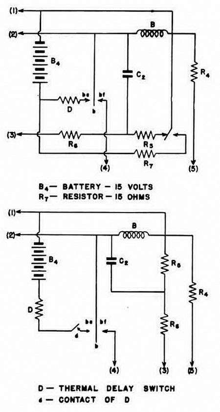 3. Protection. If, when the sound level reaches the operaton point of A, it rises too rapidly to the operating point of B for A to react (since A is delayed somewhat by C1 and put B2 in opposition to the signal current, (b) closes to (bc), S is energized by B2 as soon as (a) closes, closing (s) which provides a self-holding circuit for S as long as (a) is closed and provides a short circuit across B and prevents firing. In the earlier circuits, the self-holding of (b) on (bc) was obtained by the use of an additional battery and a definite passive period set-up determined by the heating of a thermal delay switch D to break self-holding. These systems were found less positive in action. |