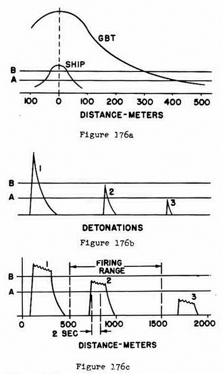 5. Schematic Representation of the reaction of A 1, A 2, and A 3 to different sound effects is shown in figure 176a, b, c. In figure 176a, it is shown that A 1, A 2 and A 3 will fire as a result of influence of a ship or GBT sweep. Firing occurs approximately wto se-conds after the sound level of A has been reached. Distances shown are approximate. In figure 176b there are three cases which result from detonations: |