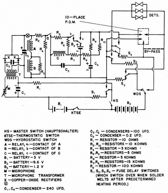 1. Closing of the master switch (HS) puts battery B1 into the circuit. KTSE will be closed if the temperature lies between -5° Centigrade and ± 35° Centigrade. Thus, the microphone and fuse-delay switch S1 are energized. After a short delay, S1 operates, putting B2 into the delay-bomb-firing circuit if the mine is in less than 24 feet of water. In this case, S2 and S3 are energized, and, after a delay, switch the detoantors into the B2 circuit and the mine fires. If the mine is in more than 24 feet or more of water, the hydrostatic switch (WDS) operates, cutting out S2, S3, and S4, which, after a short de-lay, put the detonators into the acoustic circuit. Through the ship counter and through the detonators, B2 charges C4. |