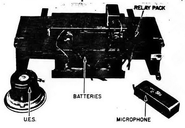 3. Protection. If, when the sound level reaches the operating point of A, it rises too rapidly to the operating point of B for C to react (less than 1/2 second), closure of (b) puts a short circuit across C3 through (c), and battery B3 helps discharge any potential on C3 and, at the same time, provides a weak current to hold (c) on its normal contact as long as (b) is closed. This condition persists as long as (b) is closed. Protection is also provided in case after closure of (a), the sound level rises too slowly to the operationg point of B. After closure of (a), C4 is subject to current drain, and, after 4-8 seconds, is no longer capable of holding C in the operated position. Thus, if the sound level does not rise to the operating point of B within the 4-8 second interval, the mechanism will react as though C had not operated and will remain passive unitl (a) opens and allows the re-charging of C4 through R9, which requires approximately 15 seconds. |