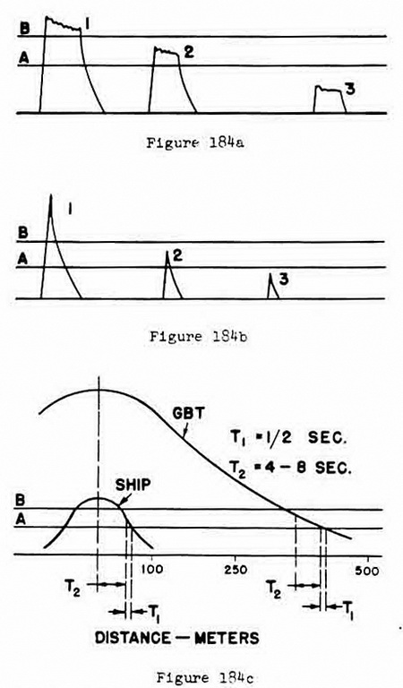 In figure 184a, it is shown that A 4 and A 105 will fire as a result of influence of a ship, but not as a result of GBT sweep. Since the ship's sound level reaches B within period T after C reachts, firing occurs when the B level is reached. In the case of the GBT, however, the B level is not reached until period T has expired and protection re-sults. (Distances shown are approximate.) |
