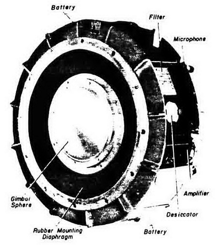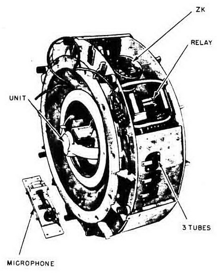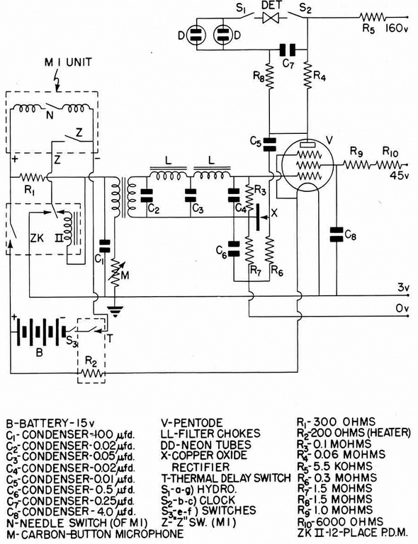Acoustic Actuation. Sound falling on the microphone is transformed into electrical im-pulses in the secondary of the microphone transformer and fed to a low-pass L/C filter. The filtered output is loaded across R3. Vacuum tube V is biased as a linear amplifier, and the amplified signal appears in the output circuit of V. Some of the amplified signal is fed back to the grid circuit by condenser C5 to rectifier X. This rectifier is connected to R6 and R7, in such a manner that a rectified signal potential appears across R7, thus making the grid potential of V more positive. This results in greater conductivity of V and a greater plate current through resistor R4. The potential drop across R4 is loaded across C7 through R8, which rovides a short charging delay. When C7 charges to a potential of approximately 110 volts, the neon tubes (DD) break down and C7 discharges through the detonator, firing the mine. |