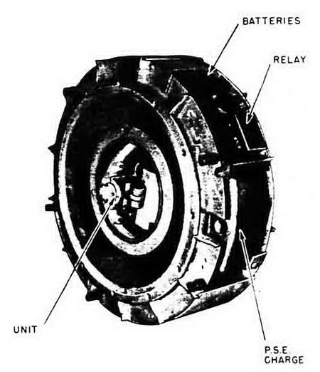 MA 1. The MA 1 unit circuit is shown in figure 200. The acoustic component is trig-gered by the magnetic component for a period determined by the time interval set by the heating of a thermal delay switch. The acoustic component contains a single pentode vacuum-tube, which, in its output circuit, fires the detonator without use of a relay system. The operation of circuit is as described below. |