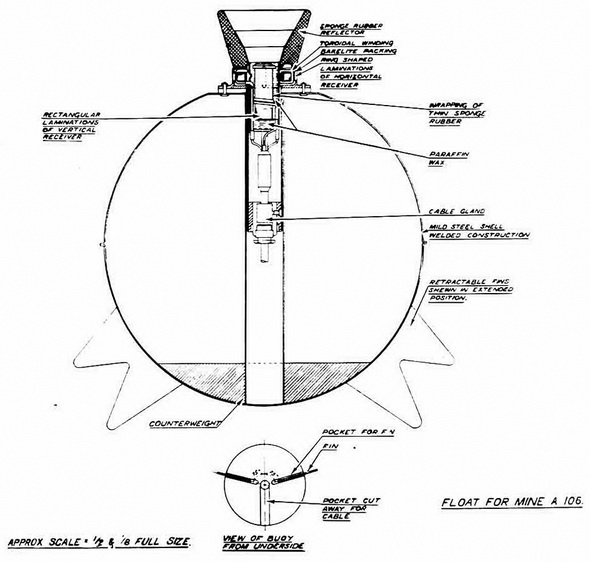 The float is normally carried in a hemispherical recess in the rear end of the mine case and is ejected from it when laid, by means of a spring. This spring is held back by a catch that is released by an impact switch, which fires an explosive release. |