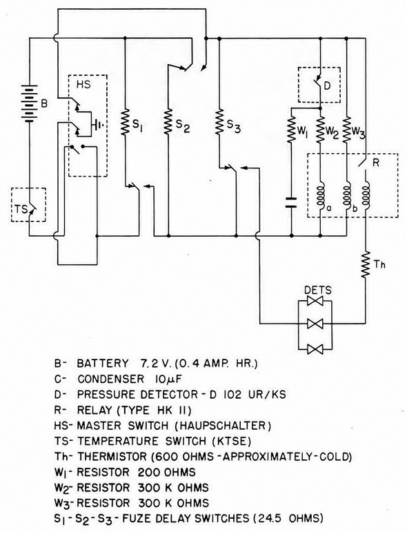 Upon impact, the bomb fuze operates the master switch, and if the temperature is within the proper range, the bi-metal temperature switch is closed. The battery energi-zes fuse delay switches S1, S2, and S3 in sequence, which gives an arming delay of about three minutes. Since the pressure switch D is normally closed, the two coils of the galvanometer-type relay R are energized equally, and the relay remains in its equilibrium position. During this period, the condenser C is charged through resistor w1 to the full battery potential. |