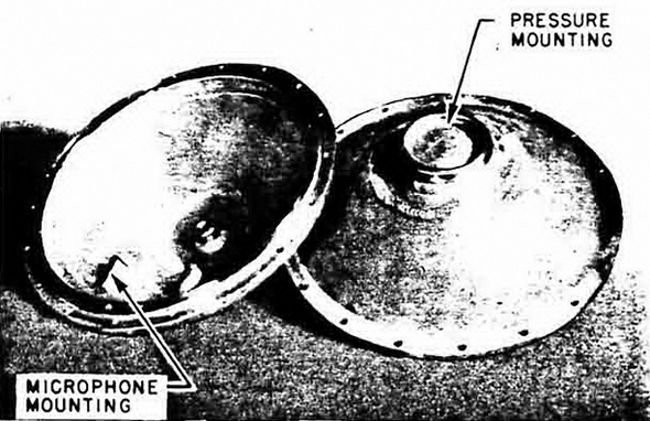 Ths microphone is highly sensitive and has an essentially flat response for both sonic and subsonic frequencies. The sonic frequencies are transmitted to the carbon button by the diaphragm, and the subsonic frequencies by the rubber bag. |