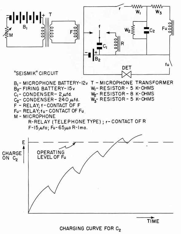 The Circuit. The circuit of the Seismik is shown in the upper half of figure 249. The microphone is fed by a battery in a transformer circuit. Introduction of the transformer is connected, unrectified, to the operating coil of relay F, which must oscillate with the al-ternating-current output, thus eliminating the high frequencies, depending upon the de-gree of damping (f) alternately charges condenser C1 from battery B2 and discharges it through the operating coil of relay R on the other half-cycle. Closure of contact (r) cau-ses charging of C2 through W1 and the charge on condensor C2 occurs in a manner simi-lar to that shown in the lower half of figure 249, with W2 causing the small discharges. When C2 is charged sufficiently to operate relay Fu, contact (fu) closes and B2 fires the detonator, or permits another influence firing component to do so. |