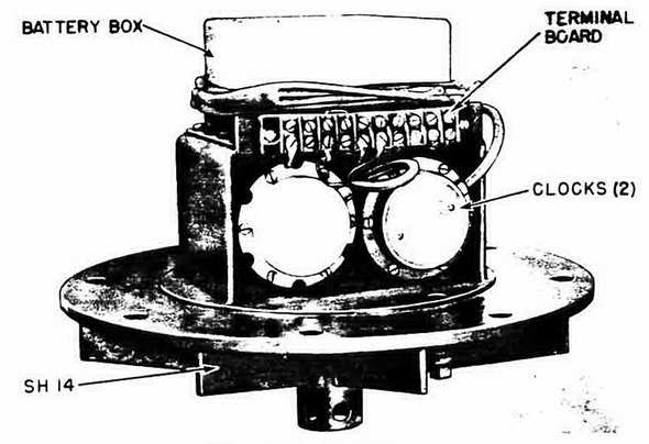 Two clocks; circle 17 fuze modifeid, with master switch starter and contacts in place of striker; preset delay from 1.5 to 54 minutes. |