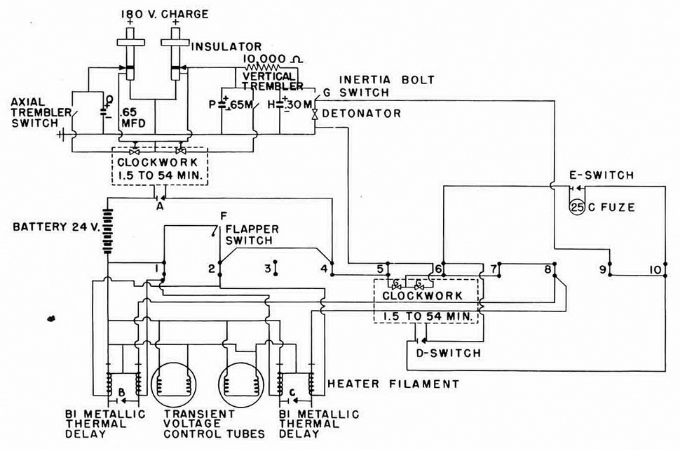 Operational Circuit Sketch (Figure 256). If the mine strikes land, inertia bolt switch (G) will close, discharging condenser (H) through the detonator. If the mine strikes wa-ter, either the axial trembler switch or the vertical trembler switch of both will close, dis-charging either condenser (P) or condenser (Q) through clockwork igniters (I). After the clock delay, witch (A) will close, placing a voltage on terminal (5) and on one contact of thermal delay switches (B) and (C) and also on terminals (1) and (2) across flapper switch (F). Closure of flapper switch (F) will energize the thermal switch (B) and (C) will energize terminal (6), firing the clockwork igniters (G). After the clock delay, switch (D) will close, charging terminal (9) and completing the circuit from terminal (9) through the detonator to terminal (5). If at any time prior to the closure of (D) switch (E) operates, it will complete the circuit from terminal (6) to terminal (9) through the detonator to terminal (5). |