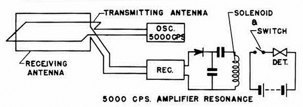 The high battery consumption of such a system makes it necessary to use a trigger-ing system which will allow the "Wellensonde" to stabilie before the fring impulse arises. It was intended to use a simple acoustic triggering system. A few seconds are necessary for the "Wellensonde" to come to equilibrium. A high geometric and electrical symmetry of the antennae and amplifiers is necessary to make the system operate properly. However, after a long period these characteristics then to vary somewhat, adn spontaneous firing may occur after the "Wellensonde" has been repeatedly switched on. In order to avoid this, a rate-of-change circuit is used in the firing circuit to allow firing only when sudden surges occur. This principle, however, was not adopted, because of the great variation in sensitivity with depth, and was considered of no operational value in a mine. |