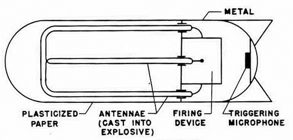 The "Wellensonde" (wave-sounder) creates an alternating electro-magnetic field around the mine case. When this field is distorted by the transit of a ship or other body, the mine fires. The firing unit devised consists of a transmitter, a receiver, antennae for both transmitter and receiver, and a firing circuit. The transmitter has an output of five watts at 5000 cps. Each antenna is rectangular, made of metal tubing, and 50 by 80 cm in size. The two antennae are mounted in the LMB IV mine-case and cast into the explo-sive. Since the antennae are mounted at right angles to each other, there is little or no mutal induction. The mine-case is made of plasticized pressed paper (pressstoff) for mi-nimum interference with the field pattern. If the symmetry of the field produced by the transmitter is disturbed by the metal mass of a ship passing overhead, a small amount of alternating current appears in the receiver's antenna, and the firing circuit of the recei-ver output fires the mine. |