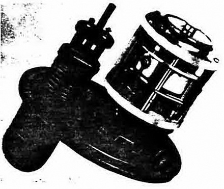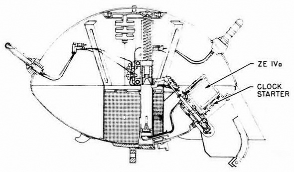 The ZE IVa is a 60-day sterilizer developed to replace the ZE IV, and it operates on the same principle. When the ZE IVa is used in the OMA mine, the detonator is connect-ed across terminals 45, figure 283. The clock is started by cam 39. At the end of its run, striker D, figure 284, is released in the same manner as in the ZE IV, disengaging the knife switch A and opening the detonator circuit, thereby disarming the mine. |