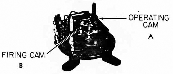 The ZK IIe (figures 288, 289) is a specially modified period delay mechanism used with the MA 1st Mine unit. It is operated by the Magnetic system of the MA 1st. A magnetic actuation starts the ZK, and after 15 seconds, cam A opens the normally closed switch A for approximately 2 minutes. If a proper acoustic actuation does not occur in the 15-second interval, the mine will not fire because switch A re-opens, de-energizing the acoustic component. After 84 such actucations cam B closes switch B permanently, put-ting the acoustic system in the cirucit. |