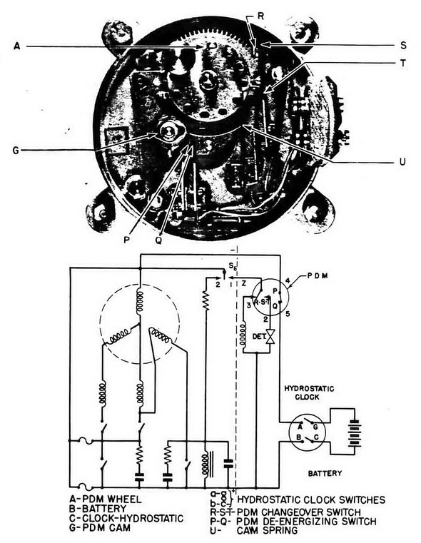 The unit and P.D.M. are rendered active when the hydrostatic clock switches closes, figure 296. A magnetic actuation closes the needle switch, and the air core relay closes S5 to contact No. 1 and energizes the P.D.M. solenoid through contacts R-S. The solen-oid releases wheel G and the P.D.M. clockwork. |