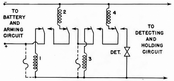 The accompanying diagram shows a typical fuse-delay switch type P.D.M. set to "3". If an actuation is registered on the unit detector, current from the battery flows through fuse-delay switch No. 1 although in some cases a by-pass fuse is used to reduce the resistance of the circuit to a value low enough to allow rapid holding in the detecting circuit. After a short delay period, switch No. 1 switches over, cutting out its own heater coil, opeing the holding circuit, and passing all current through switch No. 2 for a period long enough to allow the detecting circuit to recover. |
