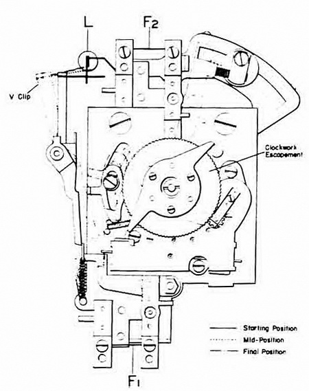 When a point of equilibrium between the two magnetic fields is reached, the needle extension no longer bears against the V-clip, and, since the escapement continues to run, an excess BLUE field is brought to bear on the needle, carrying it over to the BLUE (right) contact. When contact is made, F2 blows, and the following operations are per-formed almost simultaneously: |