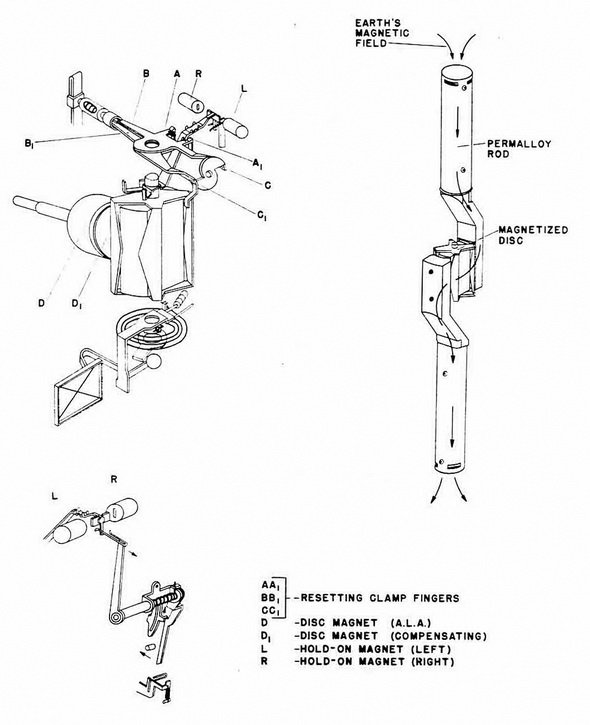 When F1 blows, the A.L.A. escapement starts and the V-clip moves to mid-position; i.e. it restrains the needle extension arm on the RED (left) side only. The escapement ro-tates magnet D and, in so doing, introduces a constantly increasing component of its field into the pole pieces around the needle body. This component is BLUE and tends to counteract the earth's field. |