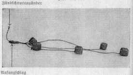 Von einer langen Zeitzündschnur 30 zweigen kürzere, gleich lange, mit Zündschnurtüllen befestigte Zündschnurenden ab, deren andere Enden in die Würfel münden. Man entzün-det die Zielfeuerreihen durch Zündschnuranzünder 29 (Bild 13). |