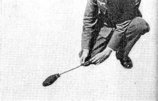 61. Es sind Beutel aus 120 mm breitem Haarkörperschlauch, die mit Nz.Man. N.P. (1,5 x 1,5) und Ocker gefüllt sind und in die ein 30 cm langes Stück Zeitzündschnur 30 einge-bunden ist. Am freien Ende der Zündschnur befestigt man den Zündschnuranzünder 29. |