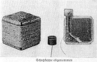 106. Der Knallkörper besteht aus einem Pappwürfel 51 x 51 x 52 mm, der mit Bindfaden dreimal umwickelt und dann gut geleimt ist. Die Körper behalten zur Unterscheidung ihrer schmutziggelbe Naturfarbe. Gefüllt ist der Würfel mit etwa 50 g Schwarzpulver. Der Zün-der besteht aus einer Zündschnur von 6 Sekunden Brenndauer. Sie tritt an einer Kante aus dem Würfel heraus, durchragt die 5 mm hohe Sicherheitstrommel und ist mit einem höchstens 2 mm hervorstehenden Zündkopf versehen. Dieser erhält zum Schutze gegen Feuchtigkeit außen einen dünnen Kunstschellacklacküberzug. Eine Schutzkappe, die sau-gend auf die Sicherheitstrommel paßt und deren obere Fläche zur Aufnahme des Reibsat-zes dient, umschließt den Zündkopf. |