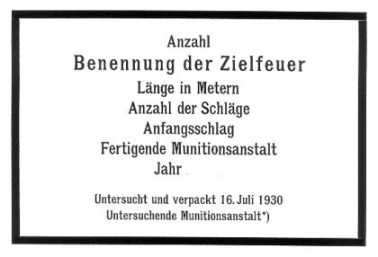 *) Diese Aufschrift ist nur nötig, wenn eine andere Munitionsanstalt als die fertigende die Zielfeuer vor der Ausgabe erneut untersucht und verpackt. |