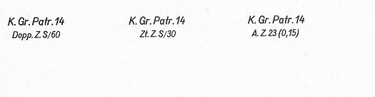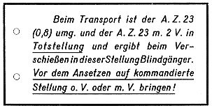 Die Anhängeschilder für Packgefäße mit Munition für andere Geschützarten sind sinngemäß zu beschriften. Die vorgeschriebenen Abkürzungen sind aus der einschlä-gigen Munitionsanfertigungsvorschrift (Einführungserlasse, Gerätlistenmappe usw.) zu entnehmen. Die Geschoße mit A.Z. 23 (0,8) umg. und A.Z. 23 m. 2 V. erhalten noch ein Anhängeschild nach Muster 103a. |