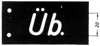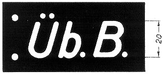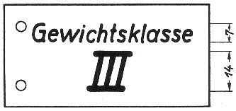 Pappe 37 x 74 x 2 mm Anhänger für jedes mit Brisanz- oder Übungs- munition gefüllte Packgefäß. Die Anhänger sind mit den römischen Zahlen I-V nach Bedarf vorrätig zu halten. Maße für das Anbringen der Löcher siehe Muster 103. Enthalten Packgefäße Munition mit Zinnring, so ist rechts von der römischen Ziffer ein 25 mm hohes schwarzes »Z« auf- zustempeln. Ist jedes Stück einer Munitionsart mit Zinnring versehen, so ist Aufstempeln des »Z« nicht nötig. Enthält die Munition Blei- Zinndraht, ist das »Z« mit roter Farbe zu drucken. |