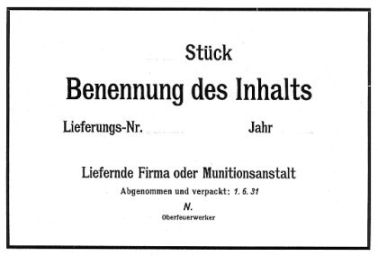 105 x 148 mm Siehe die Angaben bei Muster 36. Befinden sich die Munitionsgegen- stände in Blech- kastenverpackung, so ist für die Größe des Inhaltszettels der Blechkasten maßgebend, s. z.B. Muster 196. Für das Beschriften des Inhaltszettels gilt Muster 36. |