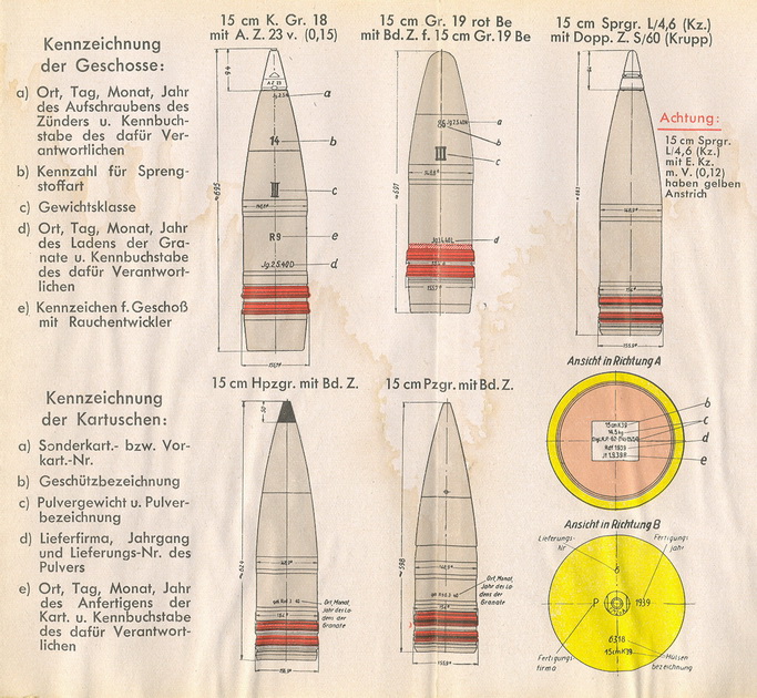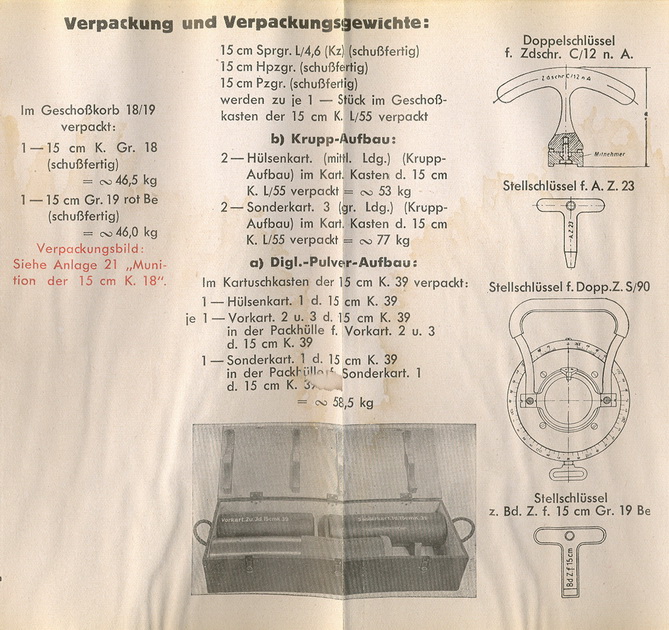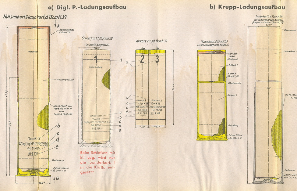 15 cm Sprgr. L/4,6 (Kz), 15 cm Hpzgr., 15 cm Pzgr., Hülsenkart., (mittl. Ldg.) (Krupp-Aufbau) und Sonderkart. 3 (gr. Ldg.) (Krupp-Aufbau) wer-den aufgebraucht und nicht mehr neu gefertigt. |