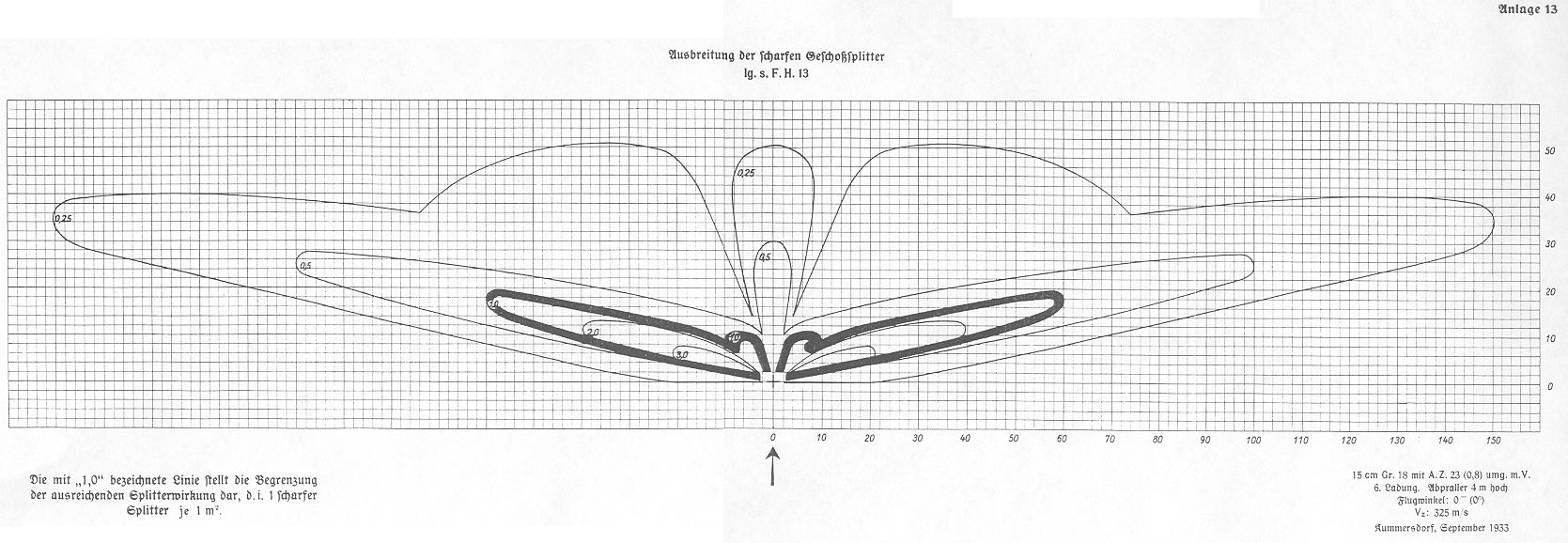 Anlage 12, Ausbreitung der scharfen Geschoßsplitter lg.s.F.H. 13Anlage 14, Bereich der ausreichenden Splitterwirkung für Sprenggranaten