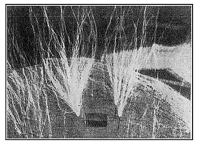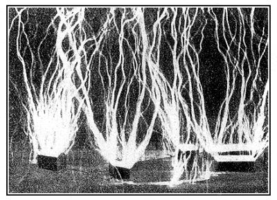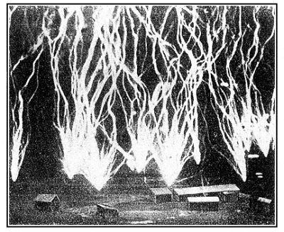 Munitionslager in Lagerhäusern und im Freien sind der Blitzgefahr ausgesetzt. Bevorzugte Blitzeinschlagstellen bilden sie, wenn sie sich auf freiem Feld befinden. Hierzu kommt noch, daß Metallmassen (Geschosse, Kartuschhülsen und sonstige Metallteile) als Kon-densator wirken. Es ist nämlich möglich, daß durch Influenz elektrische Spannung zwi-schen den einzelnen Munitionsstapeln entstehen und sich zwischen diesen entladen. Es ist deshalb ein Blitzschutz erforderlich, der die Entladung in einer genügend großen Ent-fernung vom Lager stattfinden läßt, so daß weder ein Überspringen des Blitzes auf das Munitionslager möglich ist noch eine Aufladung durch Influenz stattfindet (Bild 1, 2 und 3). |