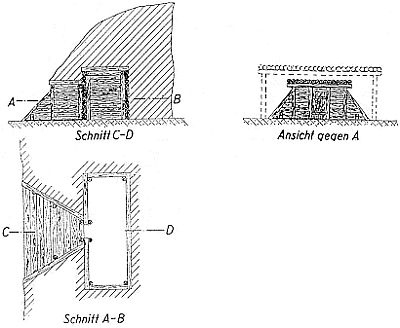 Ansicht, Grundriß und Querschnitt einer "Erdnische", d.h. eines in einen Abhang ein-geschnittenen Hohlraumes, zeigt Bild 4. |