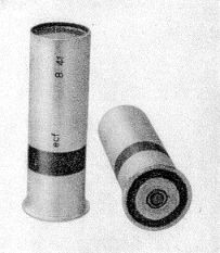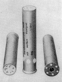 Aufdruck auf Hülsenmantel: Sternbündelpatrone weiß mit weißem Vorsignal. Auf Hül-senmantel und Boden 6 weiße Punkte; Lackabschluß weiß mit fühlbarer, innen ver-zahnter Scheibe mit 6 Zähnen; Bodenrand der Hülse auf halbem Umfang gezackt. |