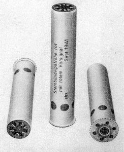 Aufdruck auf Hülsenmantel: Sternbündelpatrone rot-grün mit gelbem Vorsignal. Am Hülsenmantel dreimal auf den Umfang verteilt 3 rote und 3 grüne Punkte. Auf Hül-senboden 3 rote und 3 grüne Punkte; Lackabschluß grau mit fühlbarem Zeichen in Form eines Ringes mit einem Quersteg. |