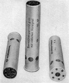 Aufdruck auf Hülsenmantel: Sternbündelpatrone rot mit rötlichem Vorsignal. Auf Hül-senmantel und Boden 6 grüne Punkte; Lackabschluß grün mit fühlbarer, innen ver-zahnter Scheibe mit 6 Zähnen; Bodenrand glatt. |