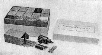 Je 10 Alarmleuchtzeichen, dazu 80 m Draht sind in einer Pappschachtel verpackt. Die Pappschachtel ist in Papier eingeschlagen und paraffiniert. |